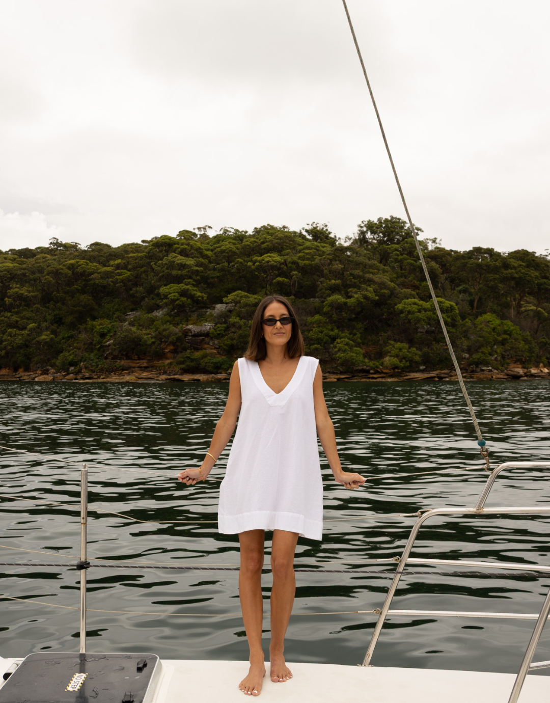 The Banks Shift dress features a low v neck at the front and back and an exaggerated hemline. This style is slightly sheer. We recommend pairing with nude or skin-toned underwear.