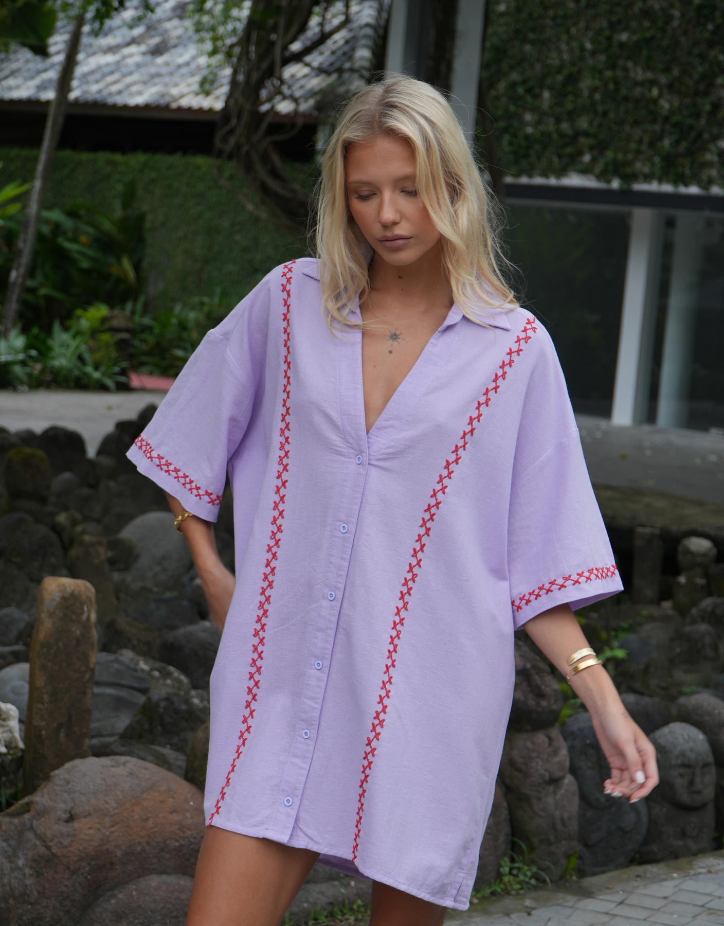 The Mimi Shirt Dress features wide sleeves and cross embroidery stitch on front panels and sleeves. All stitching is completed by hand.